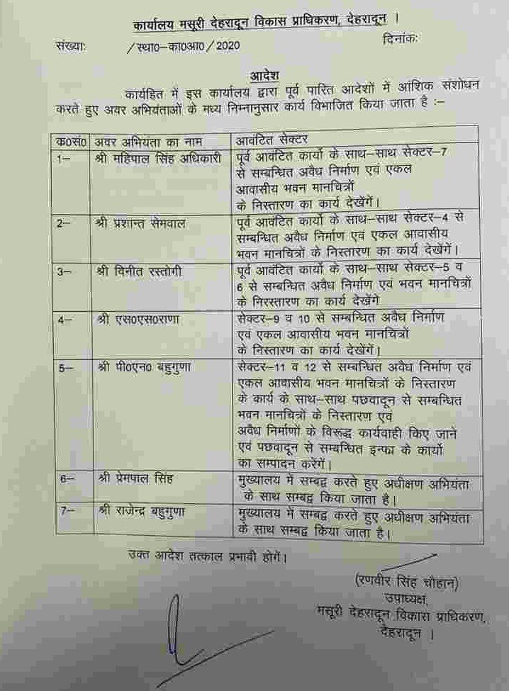 देहरादून। देहरादून के सबसे चर्चित कार्यालय मसूरी देहरादून विकास प्राधिकरण MDDA में 7 अवर अभियंताओं के कार्यों में फेरबदल किया गया है।